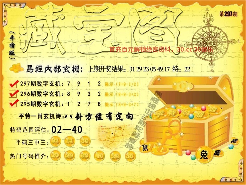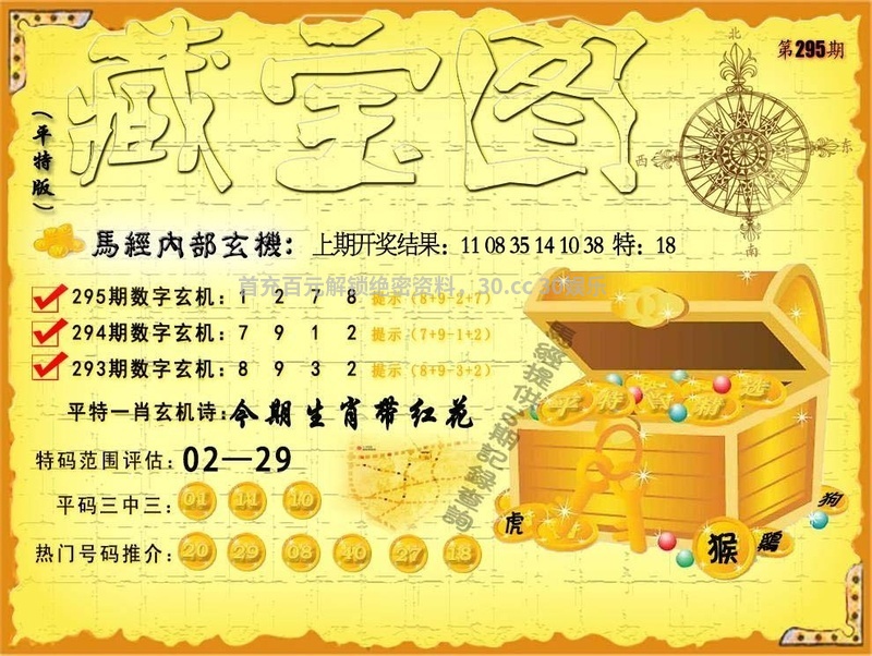 295期【今期生肖带红花】 解:今期生肖带红花,平特虎猴 特码范围评估:02-29 |